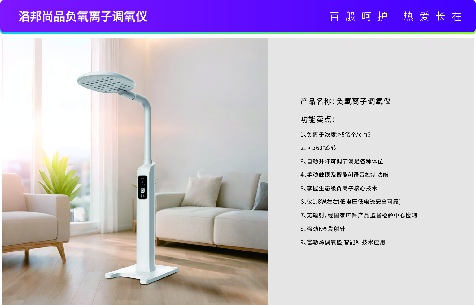 负氧离子调氧仪核心功能:搭载静电回收专利技术,避免静电残留,远超治疗标准;支持AI语音与红外遥控双操控,适配方言指令,老年人可轻松操作,360°全域立体照吸,覆盖范围广,兼顾调理与空气优化双重功效。